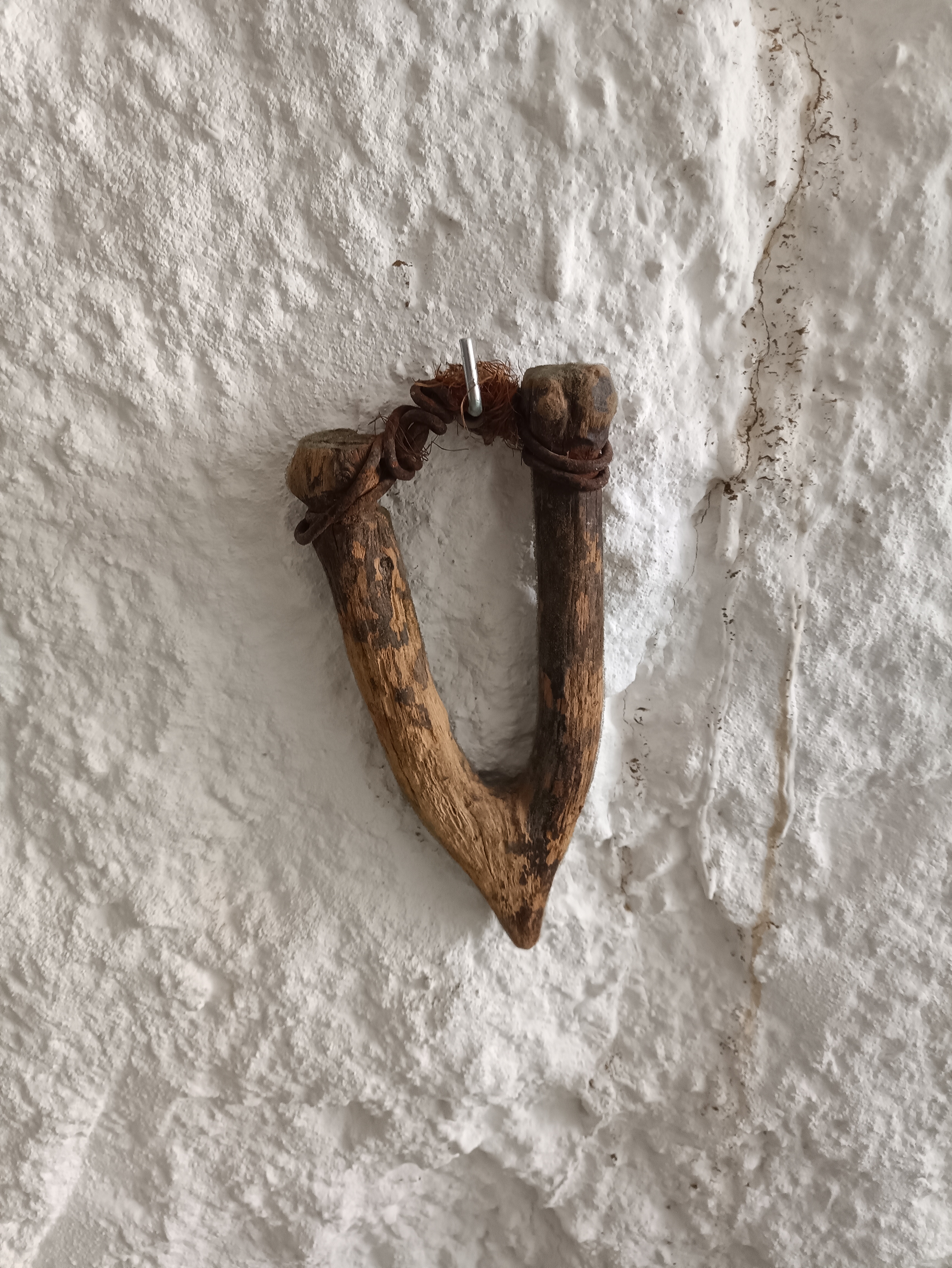 Una horqueta o horqueta de madera es una herramienta agrícola o de pastoreo hecha artesanalmente, tallada de una sola pieza de madera. Tiene varias "púas" o "dientes" (en este caso, tres), que se asemejan a un tenedor grande.