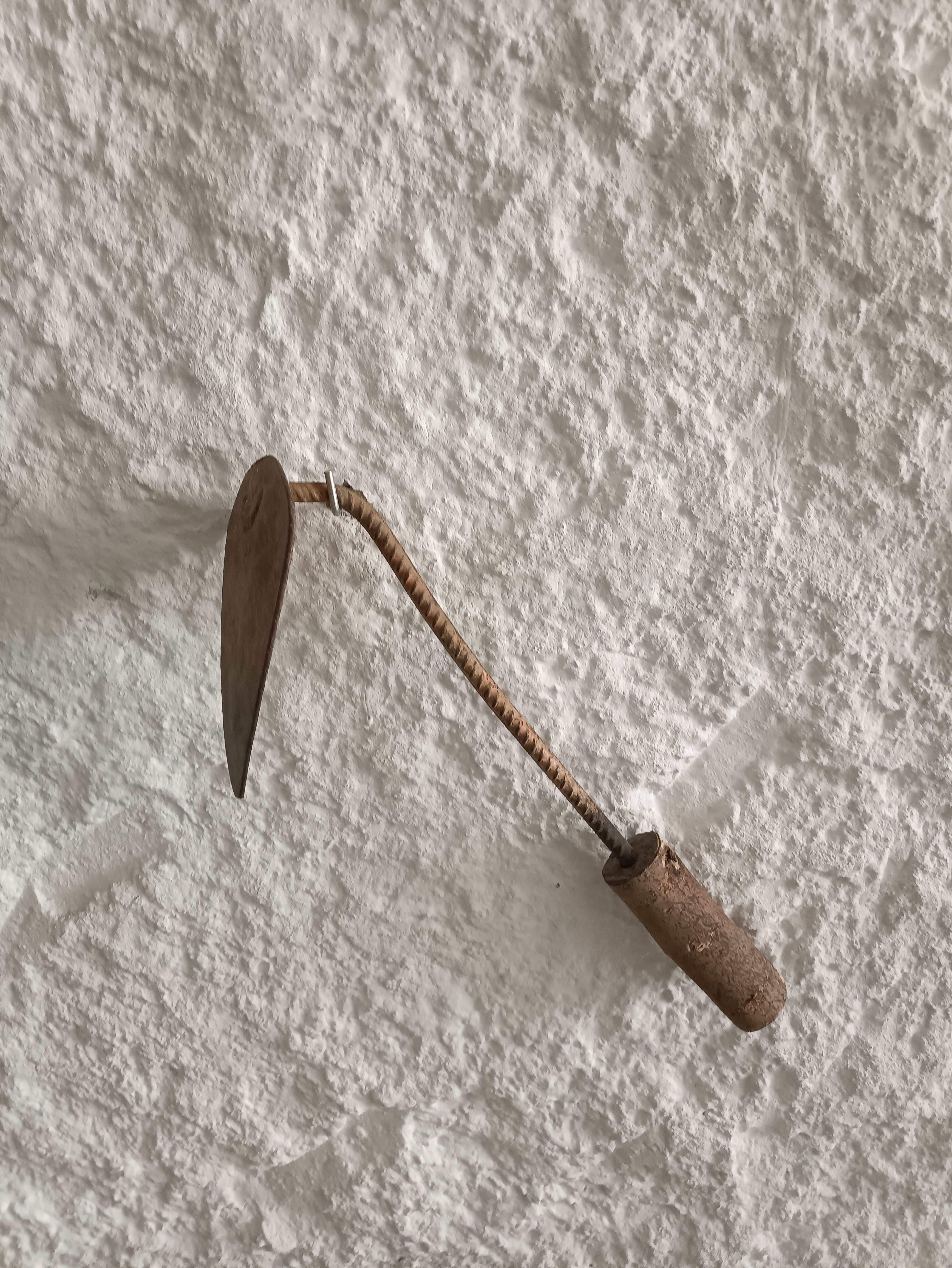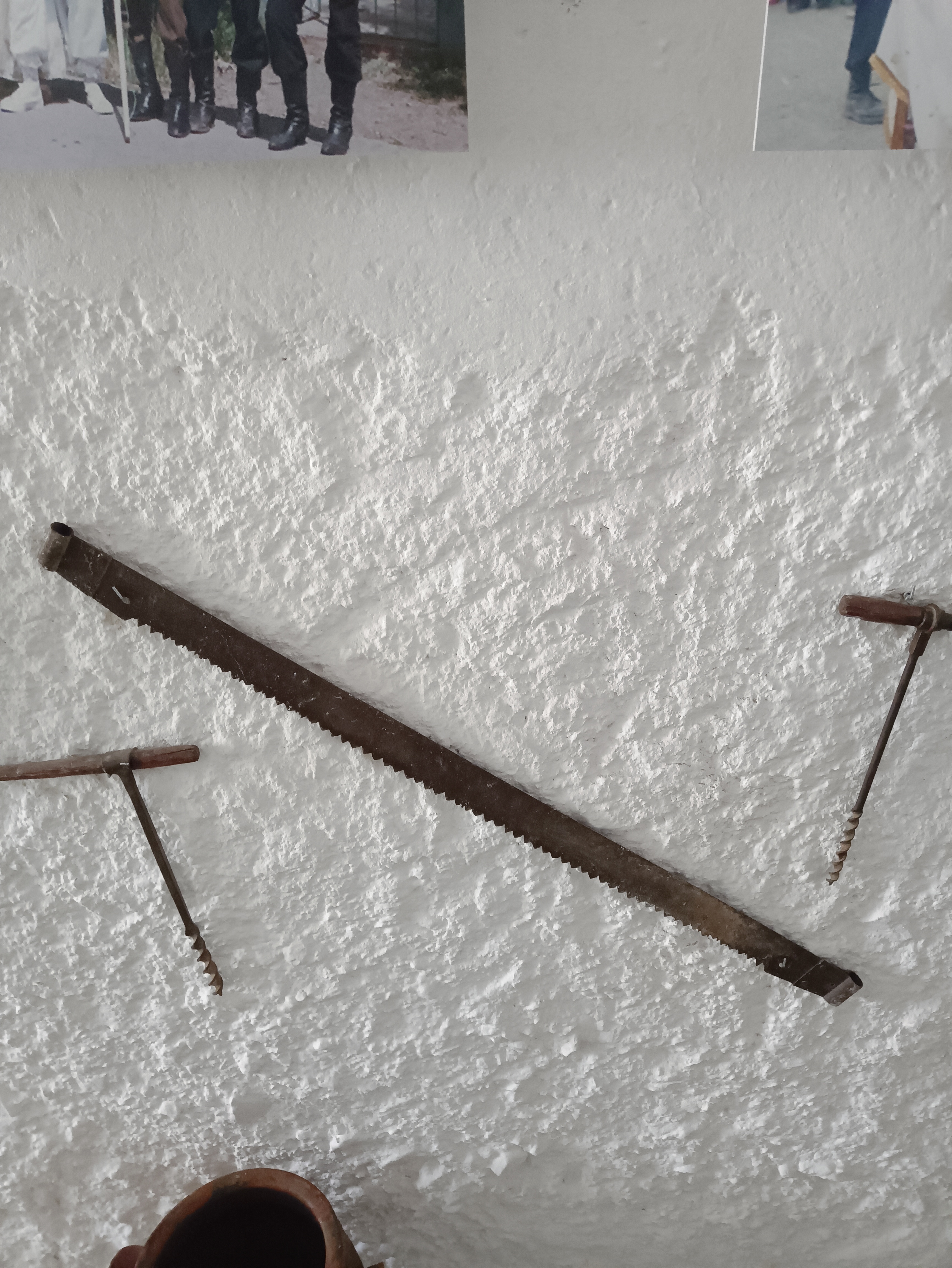 En la imagen se ven dos herramientas de carpintería antiguas colgadas en la pared: