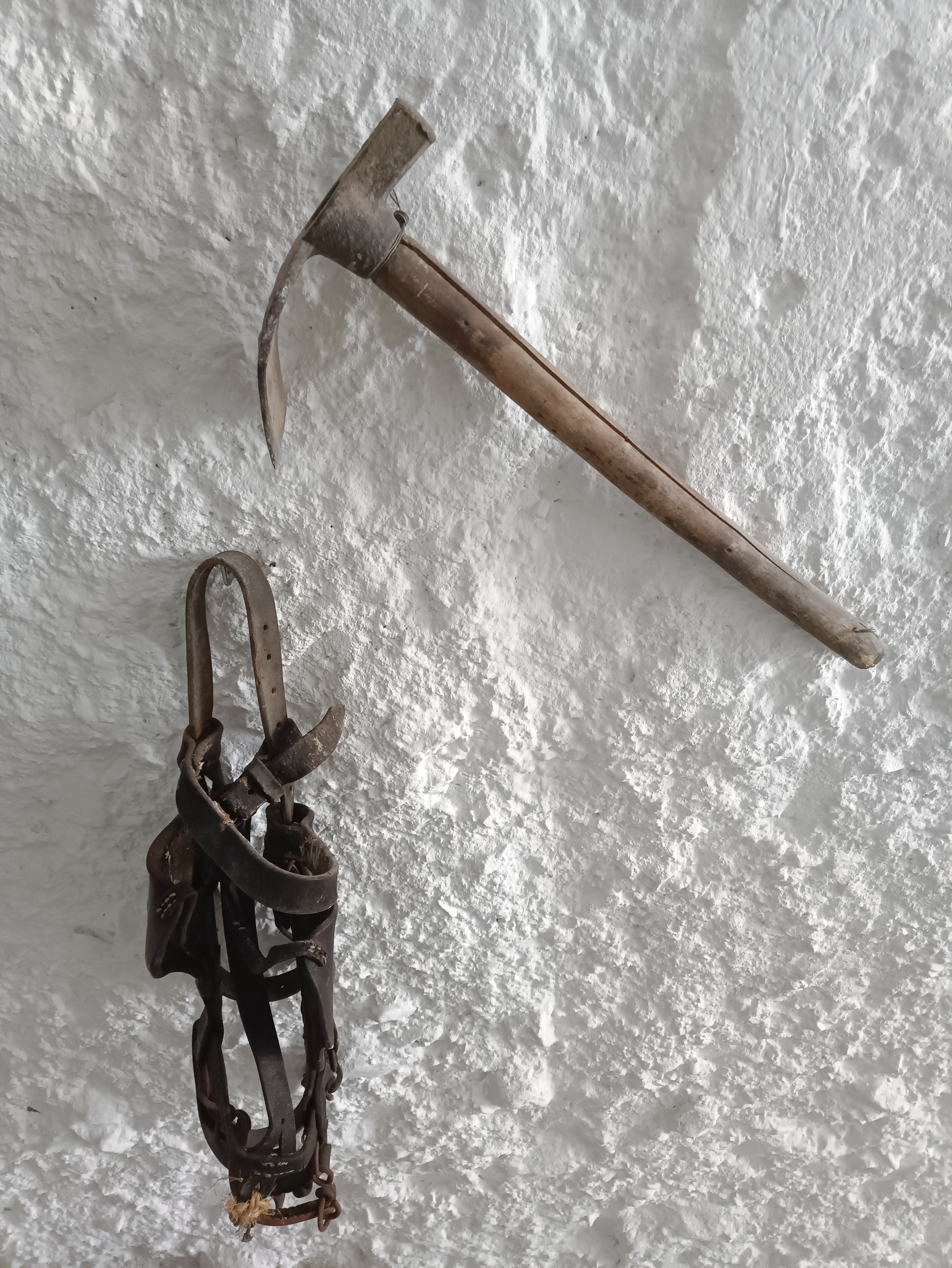 En la imagen se ven tres objetos metálicos antiguos colgados en la pared: