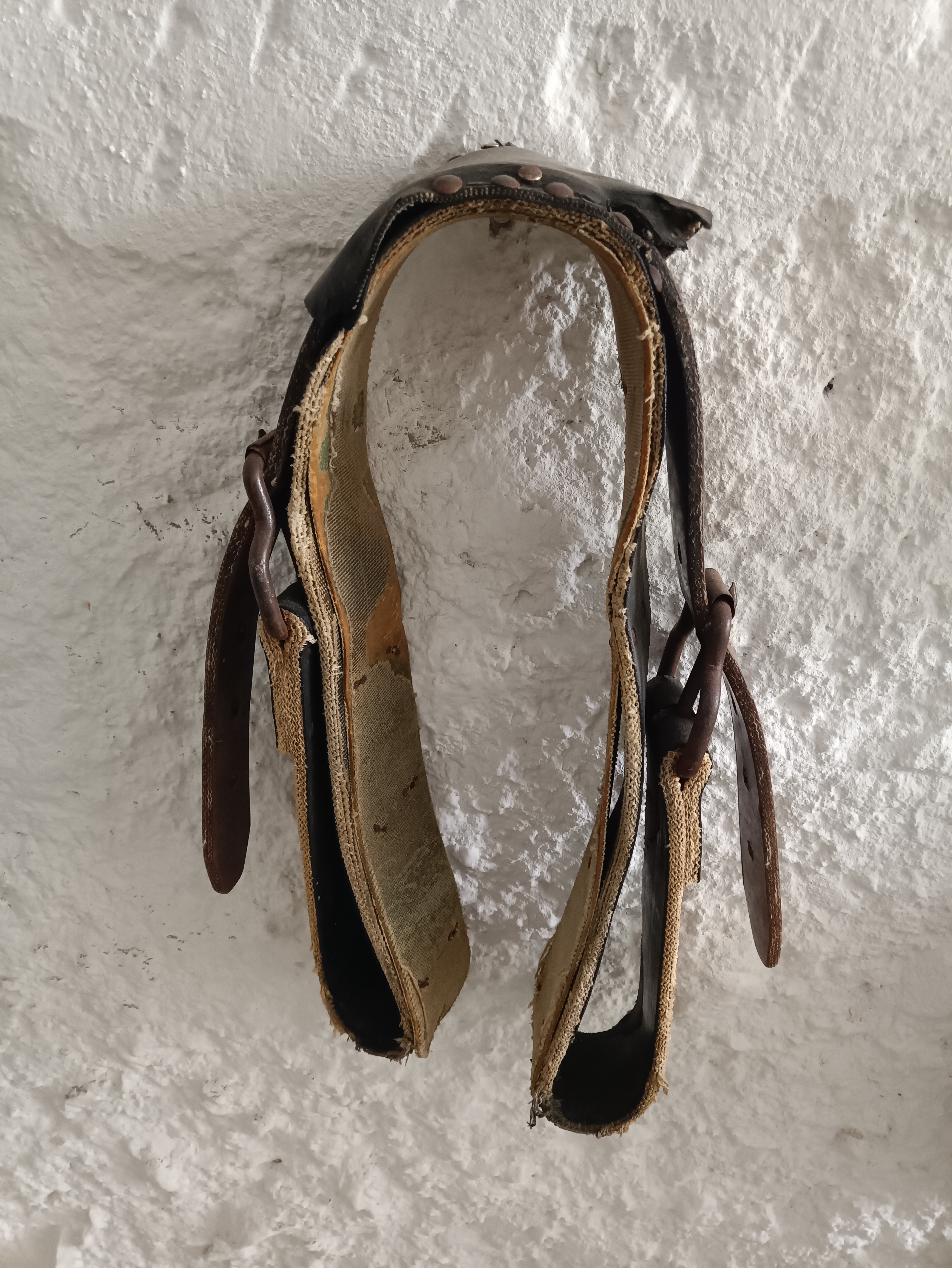 El collarón es una pieza fundamental del arnés que se coloca alrededor del cuello y los hombros del animal. Su función principal es distribuir la fuerza de tiro de manera uniforme sobre el cuerpo del animal cuando tira de un carro, arado u otro implemento.