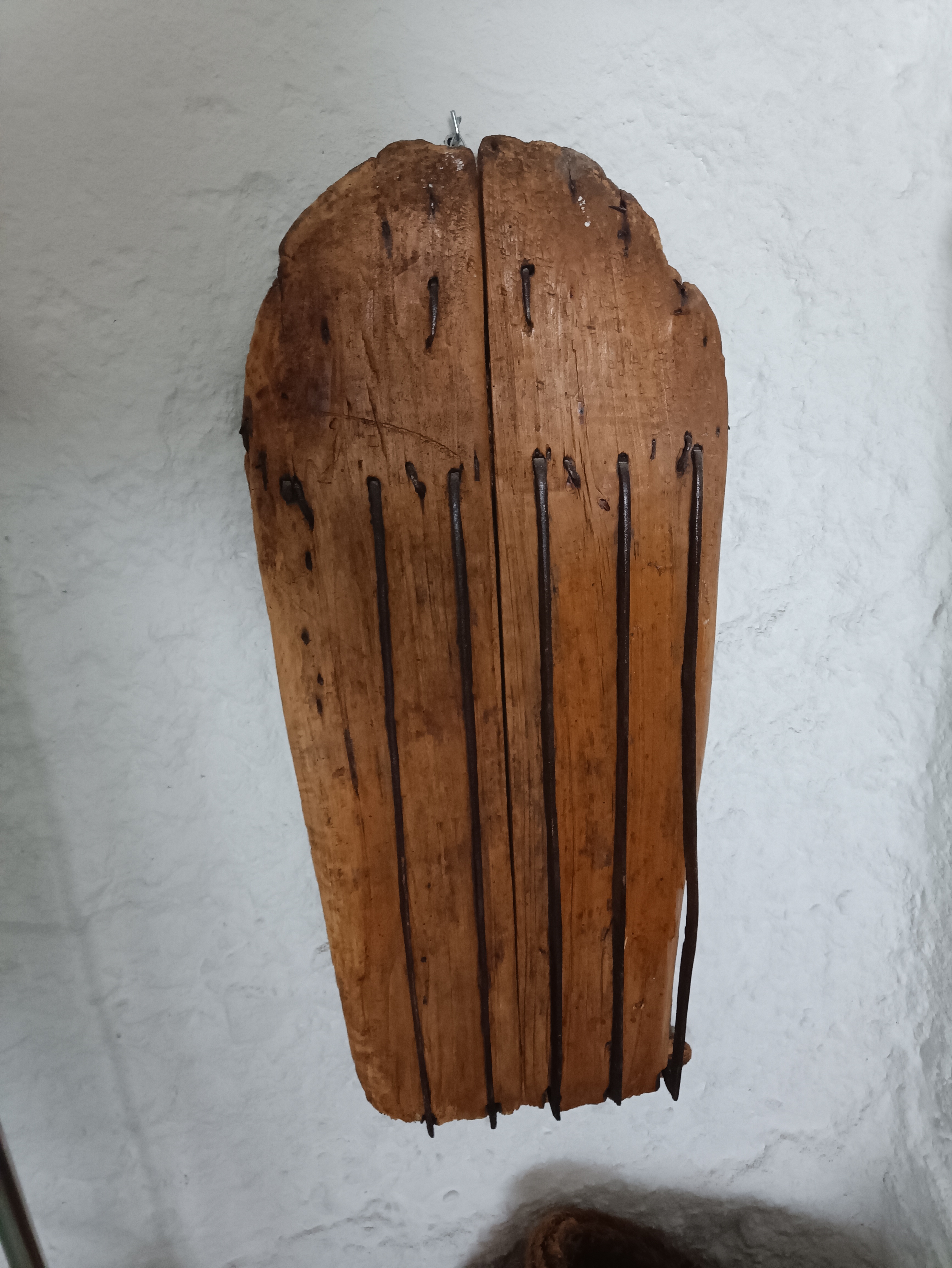 A "badana" or "pellote" is a protective piece of equipment used to shield pack animals, especially donkeys or mules, from chafing and injuries caused by saddles or harnesses. It is made of wood and features ribs or slats, which can be made from either wood or metal. These ribs provide rigidity and allow airflow to prevent sweat buildup. The cords or straps visible on the badana are used to secure it to the animal, positioned beneath the saddle.