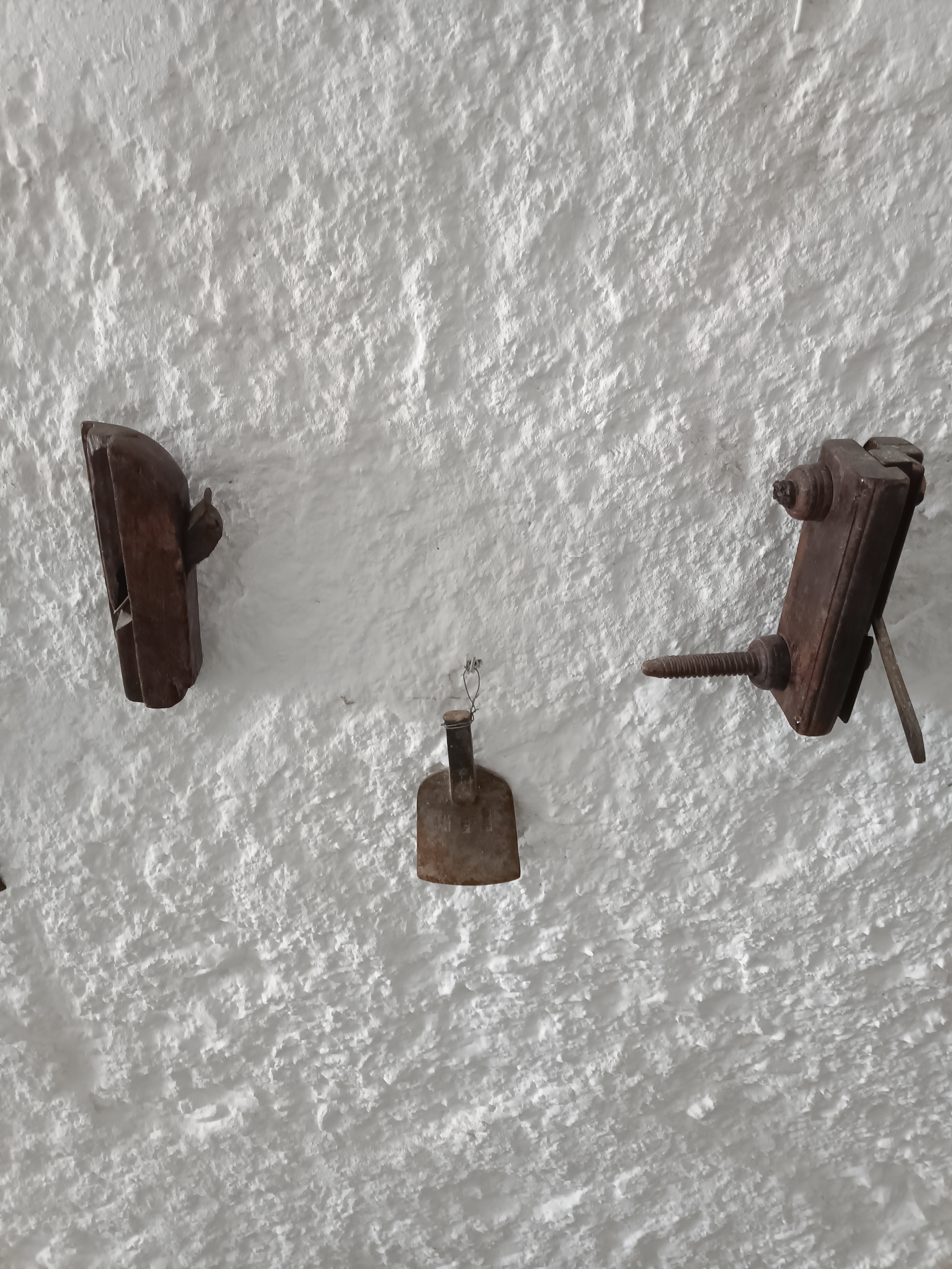 En la imagen se ven tres herramientas antiguas de carpintería colgadas en la pared: