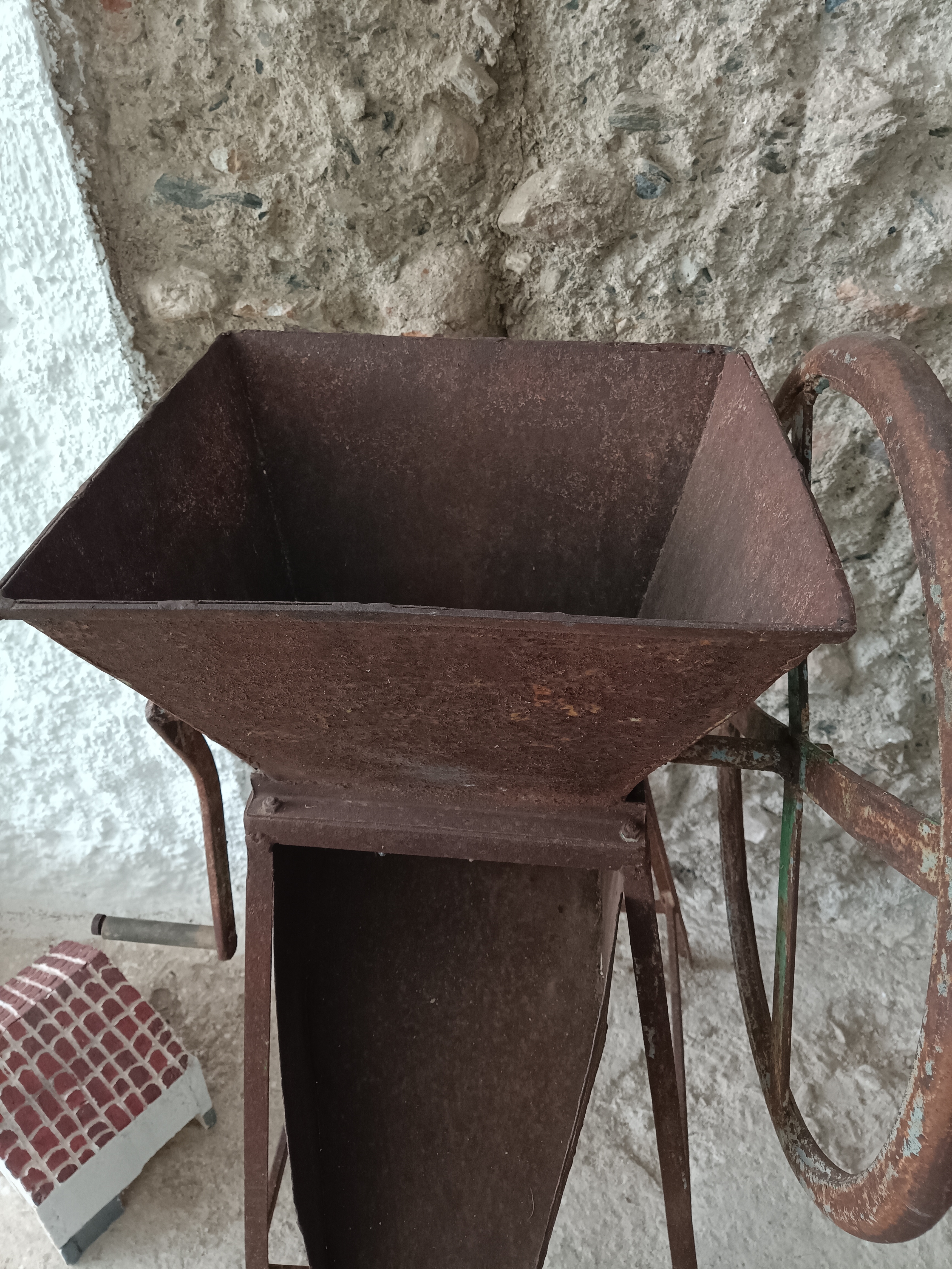 Consiste en una tolva en la parte superior donde se introduce el material a moler (probablemente grano como trigo, maíz, etc.), un mecanismo interno con muelas que trituran el grano al girar la manivela o la rueda, y una abertura en la parte inferior por donde sale la harina o el grano molido.