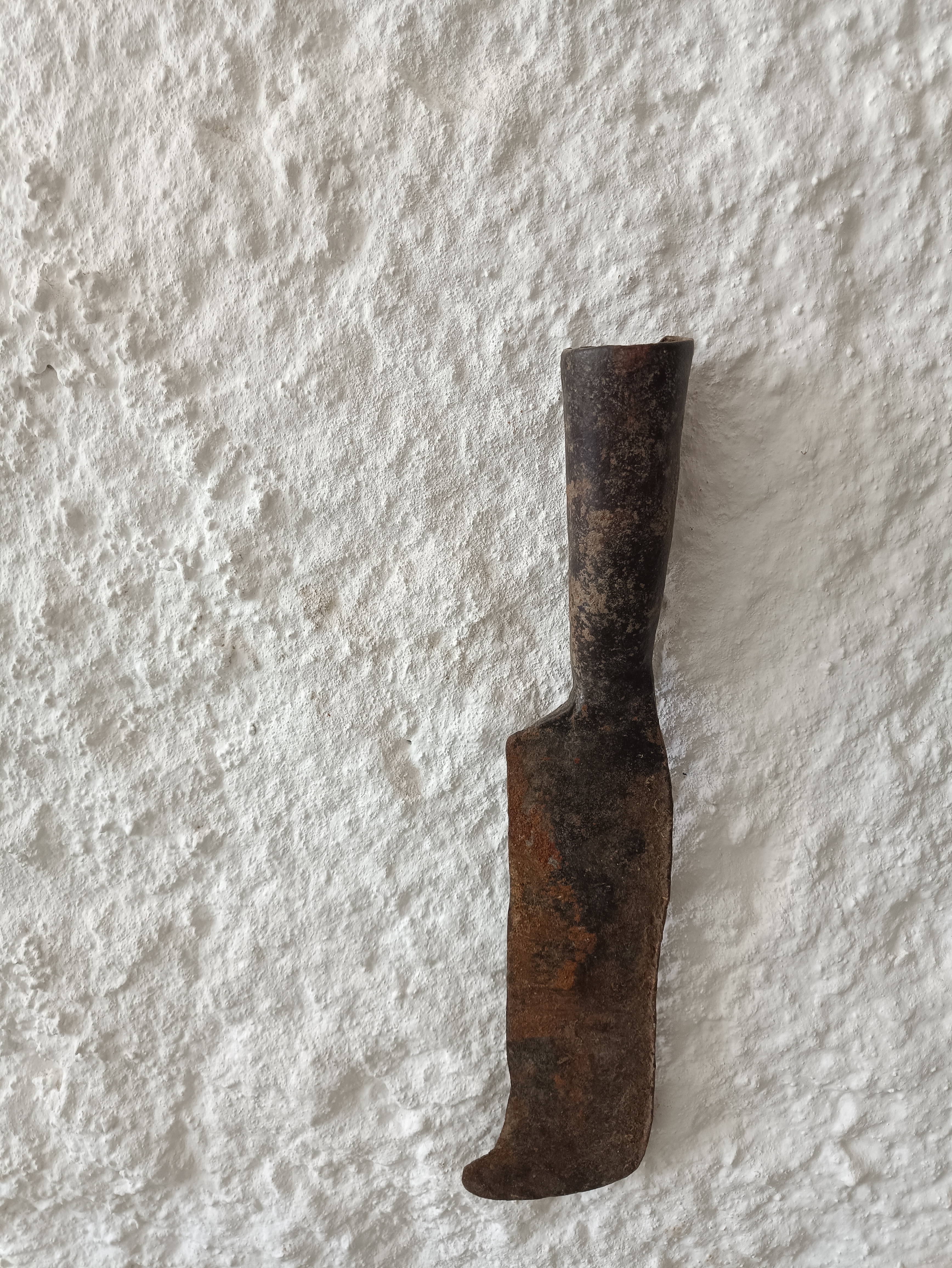 This traditional tool is distinguished by its short, curved, and sharp blade, specifically crafted for trimming tree branches, shrubs, or vines. Although the handle is not fully visible, its design suggests it was meant to be held with one hand, allowing for precise cutting.