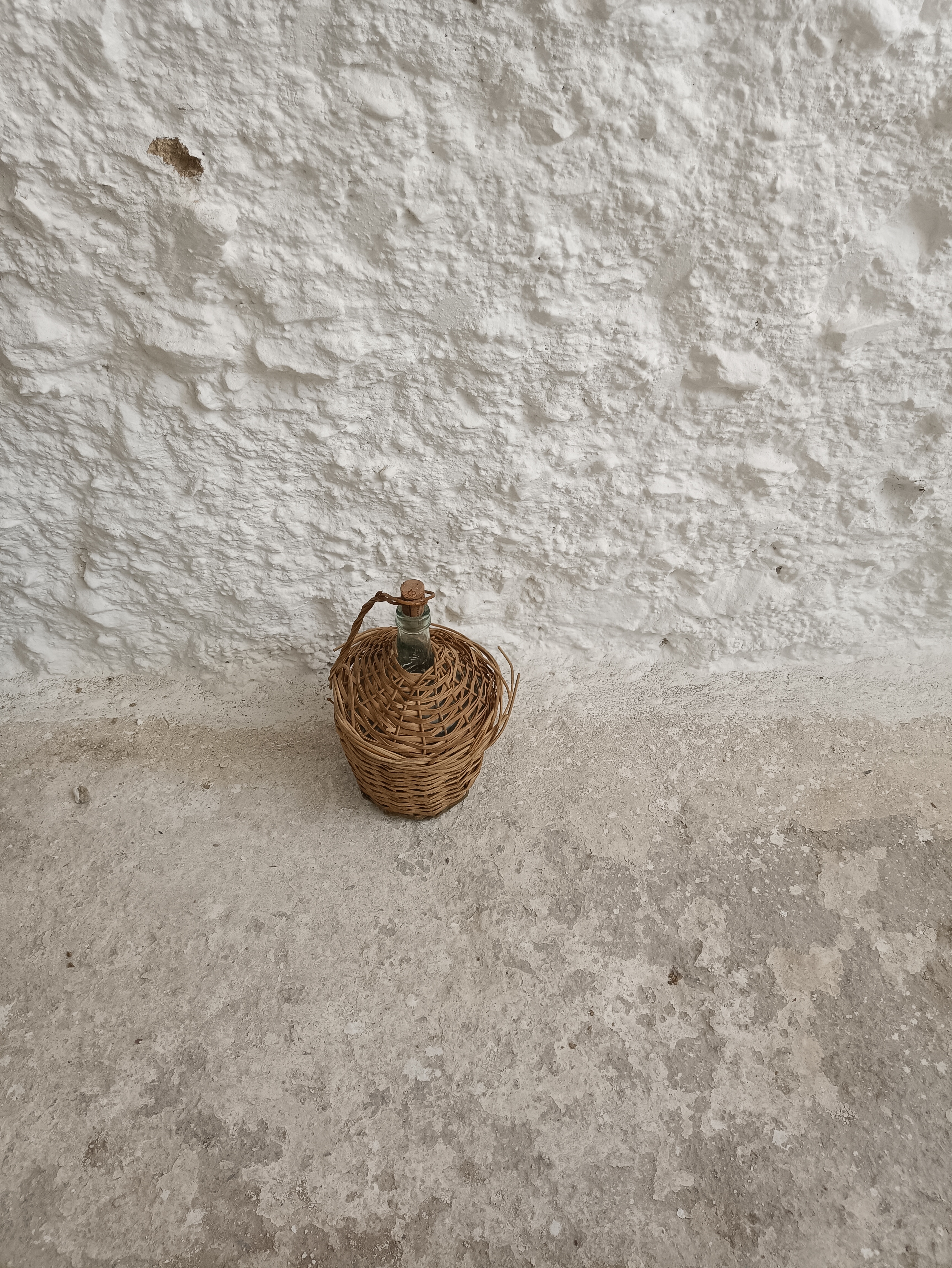 This is a bottle, typically made of glass, encased in a woven covering of natural fibers such as wicker or reed. Traditionally, this technique served to protect the contents from heat and impact. The design, often featuring handles, also makes it easier to carry.
